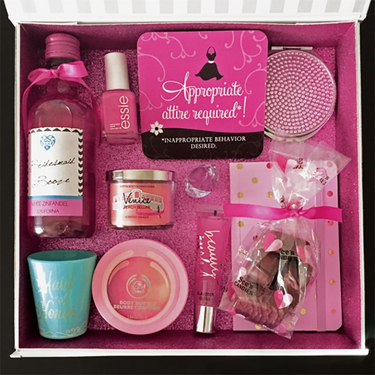 - Small wine bottle with a custom label and ribbon. I called mine “Bridesmaid Booze”